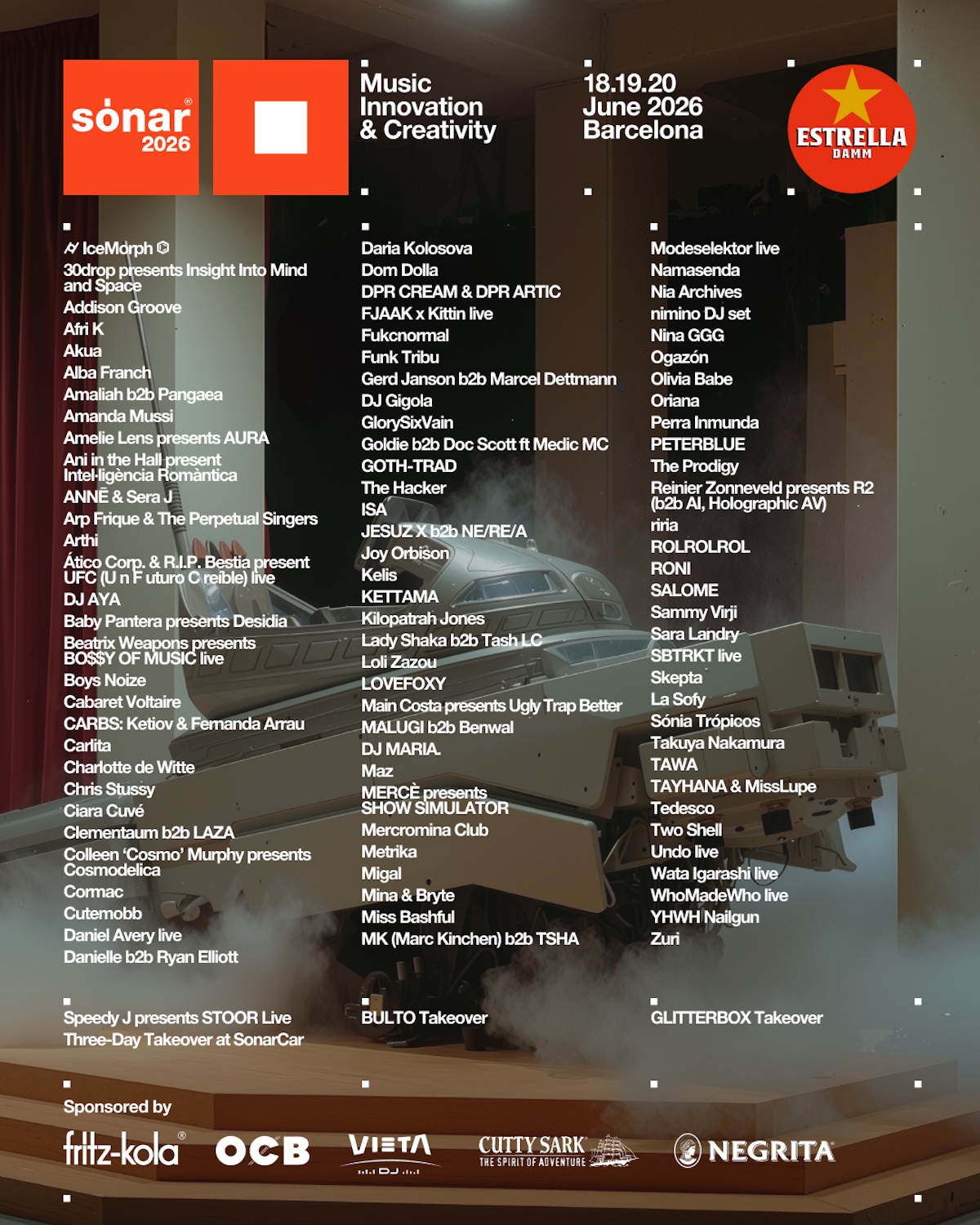 The Prodigy, Dom Dolla, Goldie b2b Doc Scott ft Medic MC, FJAAK & Kittin live, Wata Igarashi live, Speedy J presents STOOR live e YHWH Nailgun: ecco alcuni dei 65 nomi che completano la line-up dell’edizione 2026 del Sónar, in programma a Barcellona da giovedì 18 a sabato 20 giugno 2026; nomi che si aggiungono ai già annunciati Kelis, Charlotte de Witte, Amelie Lens presents AURA, Cabaret Voltaire, WhoMadeWho, Modeselektor e Chris Stussy, giusto per citarne alcuni.