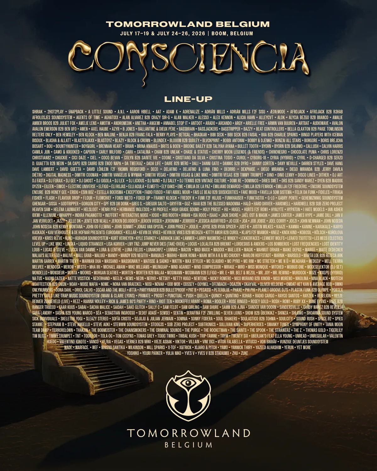 Quasi in contemporanea con la vendita dei biglietti, Tomorrowland svela tantissimi nomi che suoneranno quest’estate nel parco De Schorre a Boom, in Belgio, dal 17 al 19 e dal 24 al 26 luglio 2026 con CONSCIENCIA tema eletto per quest’anno.