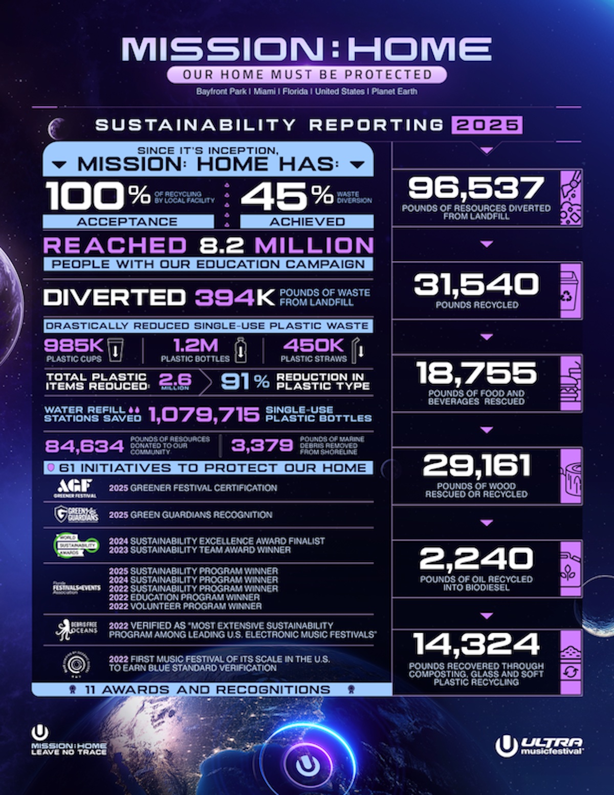 Insieme a Mission: Home Alliance, con Ultra tornano altre iniziative, in particolare Bayfront Bark, dedicata all’adozione di animali, e Making Waves, massiccio intervento di pulizia delle aree costiere prima del festival. Attivo dal 2019, il programma Mission: Home ha coinvolto 8,2 milioni di persone, ridotto i rifiuti destinati alle discariche, recuperandone ben 180mila chili ed ha supportato comunità locale, donando oltre 37mila chili di cibo, bevande ed altro materiale. Nel 2025 il programma ha superato le sessanta iniziative complessive ed ha portato il festival statunitense ad ottenere la certificazione Greener Festival, dimostrando che l’’intrattenimento sostenibile è davvero possibile.
